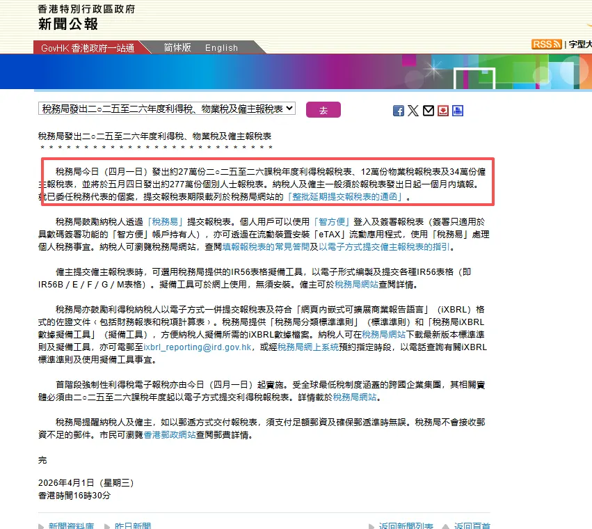 收到2026年4月1日发出的香港利得税税表后,企业须按时申报。请注意:报税不等于纳税,无利润也须报税。逾期将面临罚款、法院传票甚至限制出行等风险。零申报条件严格,不符合者须做审计,合理选择年结日可申请延期,离岸收入符合条件可申请免税。